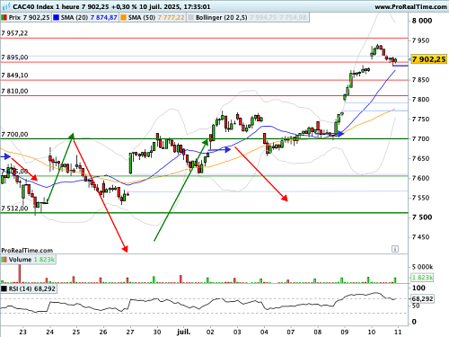 Catégories Actualité CAC 40 : Les 7 700 regagnent leurs galons de support Auteur de l’article Par Naqi Hamza Date de l’article 11 juillet 2025 Aucun commentaire sur CAC 40 : Les 7 700 regagnent leurs galons de support https://www.tradingsat.com/cac-40-FR0003500008/conseils/cac-40-les-7-700-regagnent-leurs-galons-de-support-1142324.html Par Naqi Hamza Diplômé en Finance des marchés et des entreprises avec une expérience dans la consultance et un attrait majeur pour la création et le développement d'entreprises. Voir l’archive → ← Donald Trump s’en prend de nouveau au Canada et impose une surtaxe de 35% → Point recommandations des analystes: Nexans, TFF Laisser un commentaire Annuler la réponseVotre adresse e-mail ne sera pas publiée. Les champs obligatoires sont indiqués avec *Commentaire * Nom * E-mail * Site web Enregistrer mon nom, mon e-mail et mon site dans le navigateur pour mon prochain commentaire.