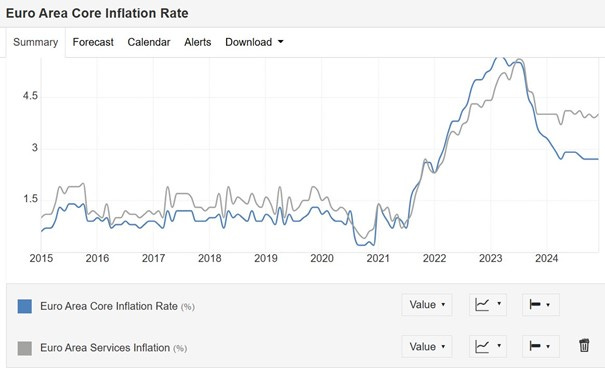 Le problème pour la Zone euro est que l’inflation des services reste rigide, se stabilisant assez nettement autour de 4 %. Étant donné que les services représentent la grande majorité de l’activité et de la demande économique, il s’agit de la principale inflation que l’on observe dans l’économie.